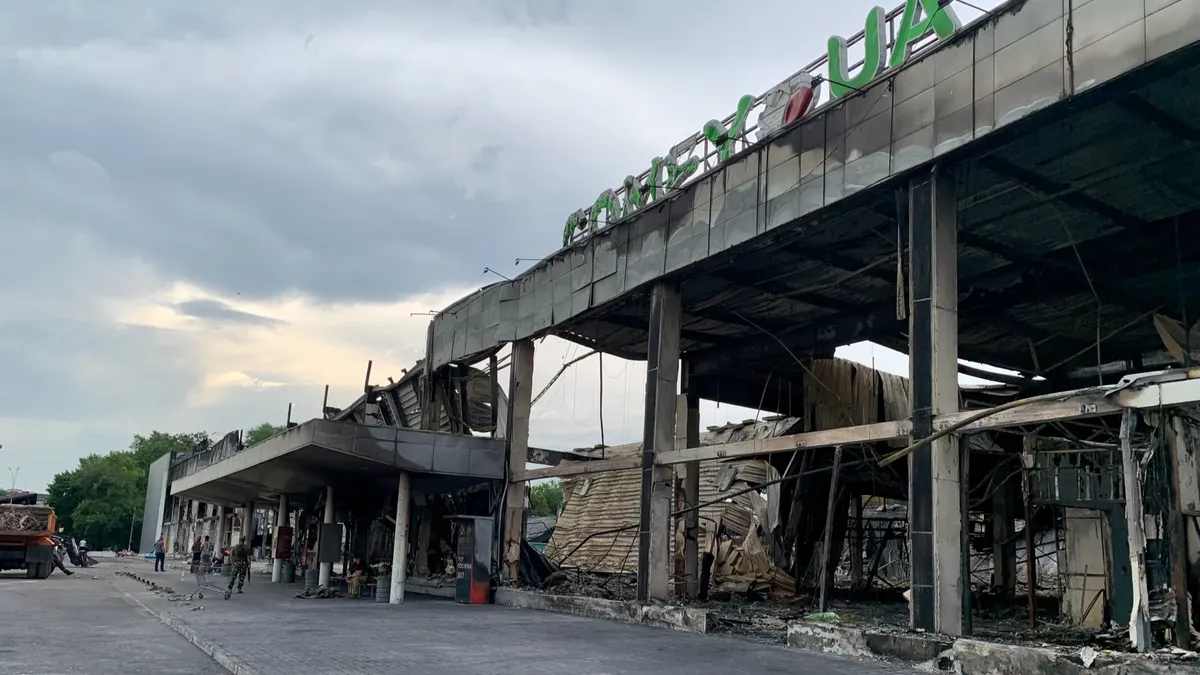 Татьяна Гуденко, кассир гостиницы «Дніпровські зорі», закрывает глаза, произносит «Сейчас!», просит прощения, выписывает счет и дает ключ. Гостиница — прямо через дорогу от руин, которые после 16:00 27 июня перестали быть торгово-развлекательным центром «Амстор», крупнейшим в Кременчуге. Туда попала российская ракета «Х-22». Если точнее, то в правую часть здания, в магазин бытовой техники «Comfy». Скелеты вывесок “Соmfy» и «Rozetka», самого популярного онлайн-гипермаркета Украины, — все, что осталось на выгоревшем, развороченном пространстве от десятков международных и украинских ритейлеров.