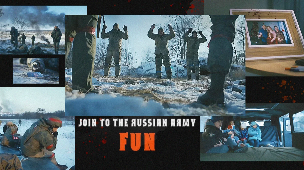 На прошлой неделе в телеграм-канале одиозного российского подразделения ДШРГ «Русич» появился пост, автор которого хвалит пропагандистский ролик украинского производства. На видео актеры, наряженные в камуфляж «цифра», с видимым удовольствием расстреливают своих пленных противников, затем нападают на жилой дом, где избивают женщин и увозят с собой детей в «буханке», отмеченной буквой Z. «Join to the Russian army», — сообщается в финале видео (англоязычная формулировка некорректна, подразумевается призыв «Join the Russian army» или «Присоединяйся к российской армии». — Прим. ред.).