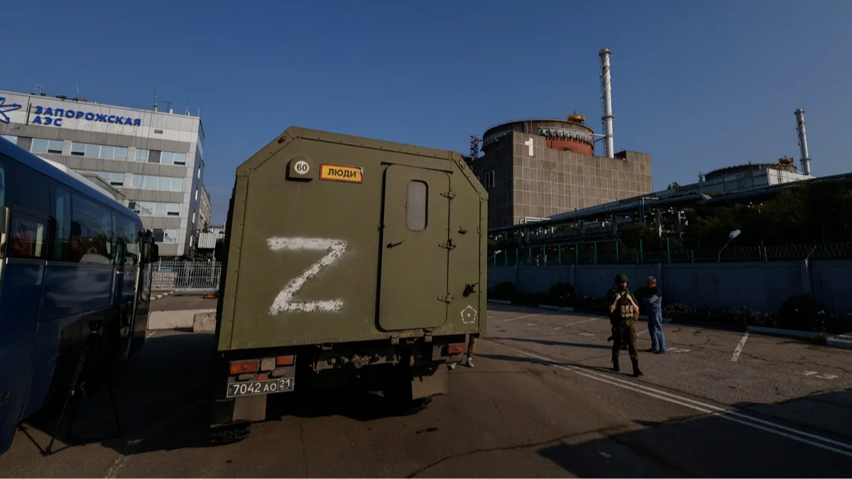 Машина российских военных на фоне Запорожской атомной электростанции в Энергодаре, Украина, 15 июня 2023 года. Фото: Сергей Ильницкий / EPA