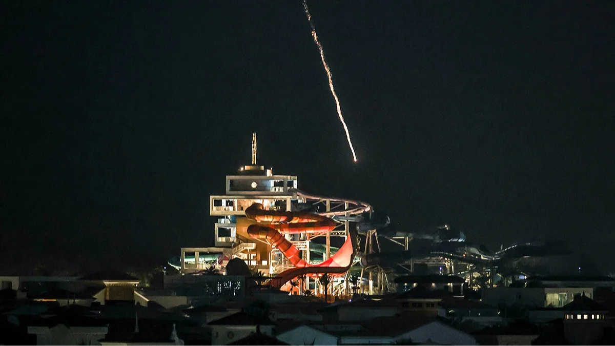 Сбитая ракета падает в море недалеко от дубайского архипелага Пальма Джумейра, 1 марта 2026 года. Фото: Fadel Senna / AFP / Scanpix / LETA