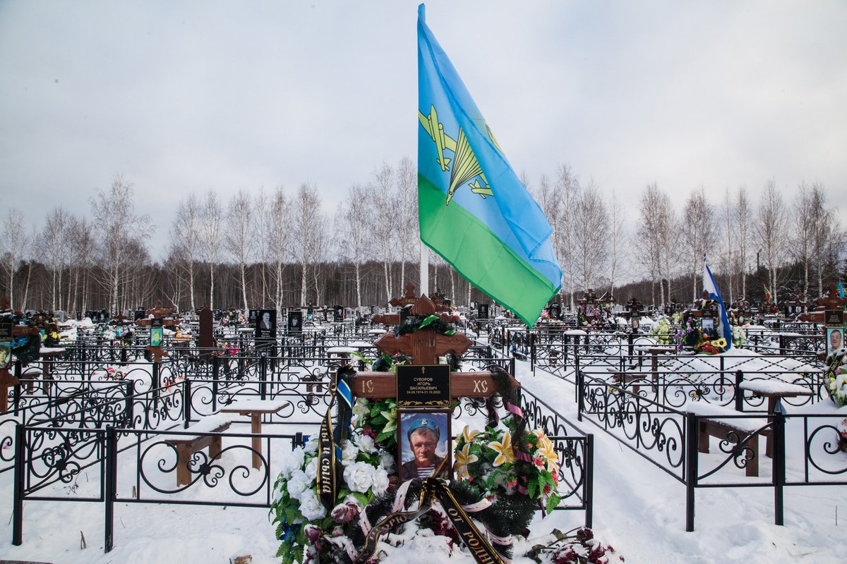 На морозном ветру развеваются флаги «Своих не бросаем», «После нас тишина», «Граница на замке». С Иваном (имя изменено), 40-летним местным жителем, мы ходим между свежих могил по заснеженному кладбищу города Невьянск. Здесь много бумажных цветов, пластиковые венки еще не выцвели. Почти одинаковые кресты на пяти могилах у центрального входа. За ними оставлена земля на перспективу, «обычных» людей хоронят дальше.