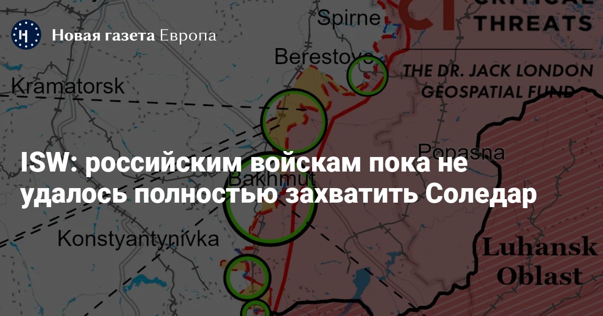 Российским войскам пока не удалось полностью захватить Соледар в Донецкой области, несмотря на ложные заявления некоторых российских источников о том, что город пал и что Бахмут рискует оказаться в неминуемом окружении, сообщает американский Институт изучения войны (ISW) в своей ежедневной сводке.