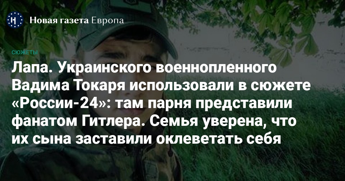 25-летний украинский военнослужащий Вадим Токарь с позывным «Лапа» год назад попал в российский плен. С тех пор близкие потеряли с ним связь. Спустя 11 месяцев телеканал «Россия 24» показал сюжет с Токарем, в котором представил военного «нацистом», «фанатом Гитлером» и человеком, отчаянно желающим убивать россиян. «Новая-Европа» рассказывает настоящую историю Вадима Токаря.