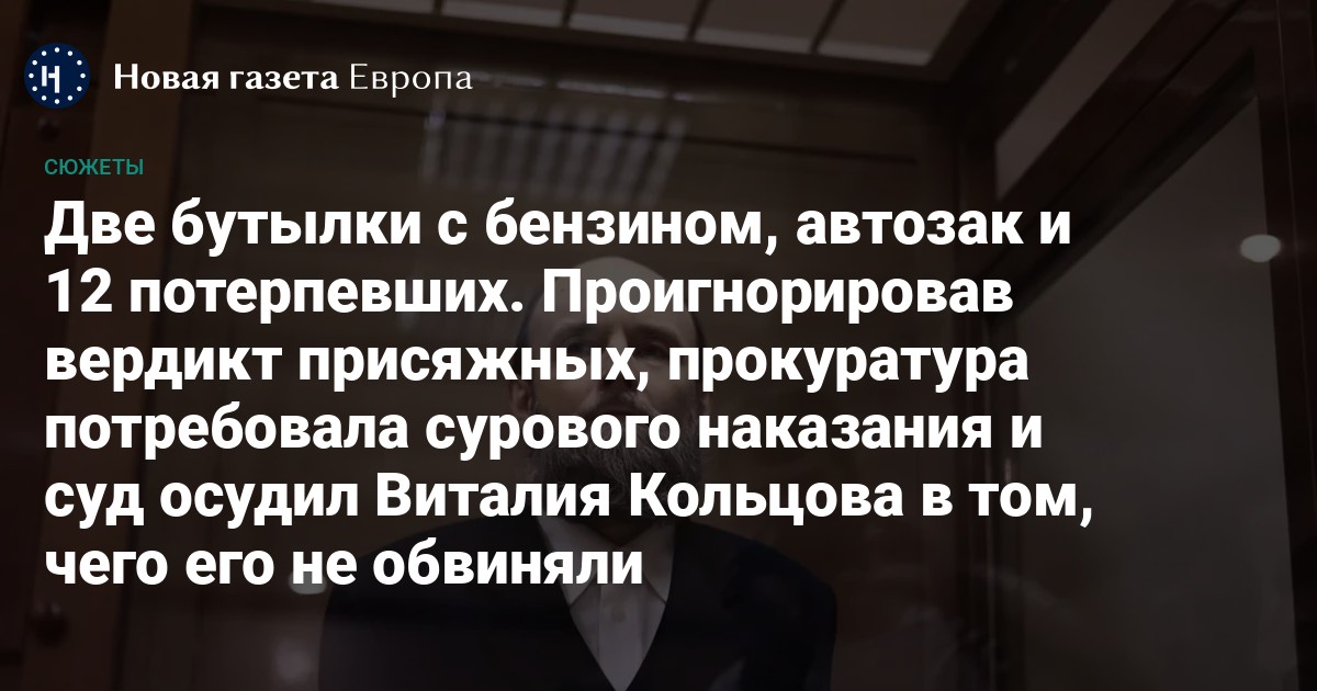 Мосгорсуд приговорил 46-летнего москвича, многодетного отца Виталия Кольцова к шести годам заключения за две брошенные бутылки с бензином в автозак. Присяжные признали его виновным в порче полицейского имущества, но не поверили стороне обвинения насчет того, что Виталий еще и пытался совершить убийство 12 омоновцев. Несмотря на вердикт народных судей, прокуратура продолжала настаивать: требовала для Кольцова 19,5 лет строгого режима. Однако суд принял свое решение и переквалифицировал обвинение с «покушения на жизнь полицейских» на «применение насилия, не опасного для жизни и здоровья, в отношении представителя власти» (ст. 318 УК).