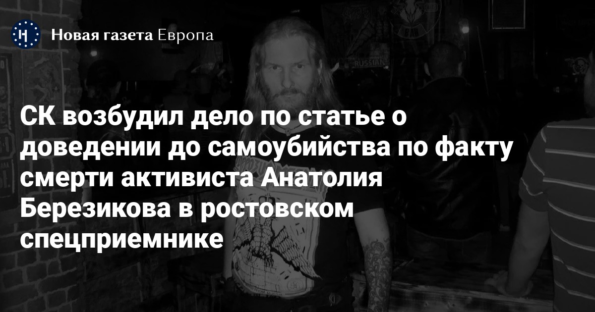Следственный комитет возбудил уголовное дело по статье о доведении до самоубийства по факту смерти 40-летнего активиста Анатолия Березикова в ростовском спецприемнике. Об этом сообщает «Первый отдел» со сылкой на постановление ведомства.
