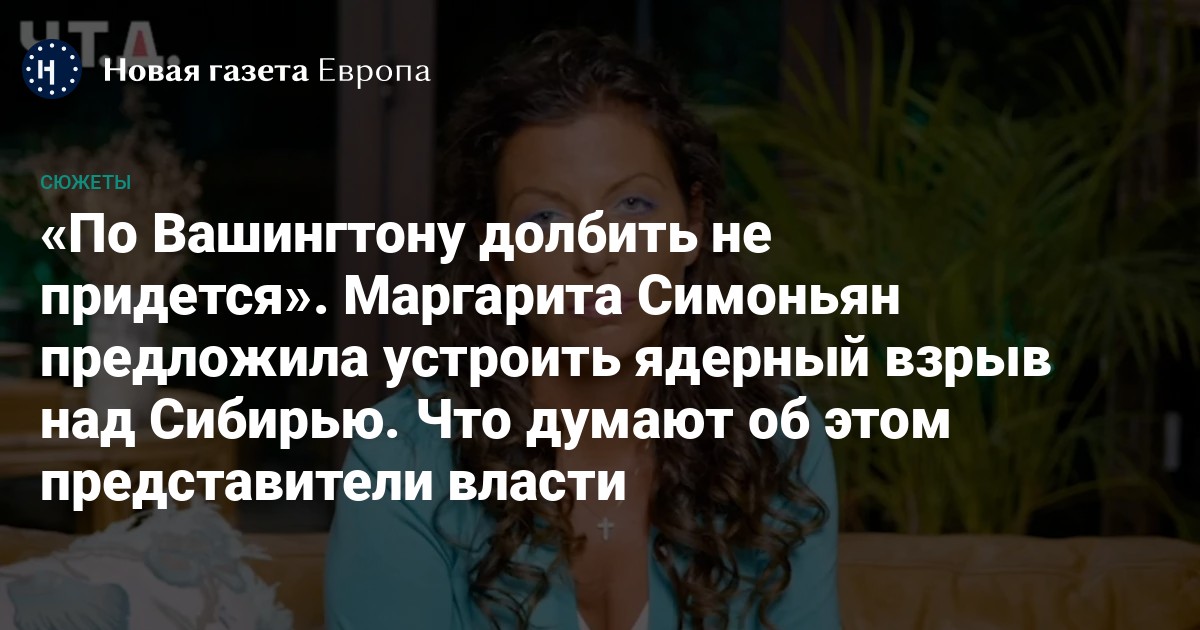 Главный редактор RT Маргарита Симоньян в авторском шоу «Ч.Т.Д.» заявила, что термоядерный взрыв над Сибирью поможет вывести из строя всю радиоэлектронику и вернуться в 93-й год. Проведение такого взрыва журналистка назвала гуманной и даже «травоядной» опцией.