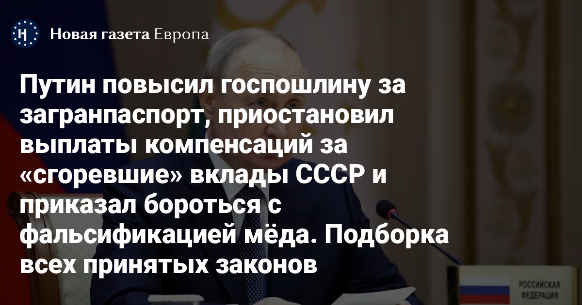 Владимир Путин накануне подписал несколько законов, касающихся выплат, пенсий и госпошлин. В частности, президент повысил пошлину за биометрический загранпаспорт с 5 до 6 тысяч рублей, приостановил выплаты компенсаций за «сгоревшие» вклады времен CCCР и индексации зарплат госслужащих, кроме военных и силовиков. Помимо этого, в России приняли рекордный военный бюджет, акцизы на вино и шампанское увеличатся, а власти начнут бороться с фальсификацией мёда.