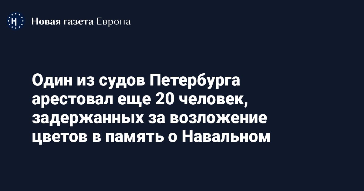 Калининский суд Петербурга арестовал 20 человек по статье об организации «массового одновременного пребывания» граждан в одном месте (ч. 1 ст. 20.2.2 КоАП), задержанных при возложении цветов в память о погибшем в колонии политике Алексее Навальном. Об этом «Новой газете Европа» сообщила одна из задержанных.