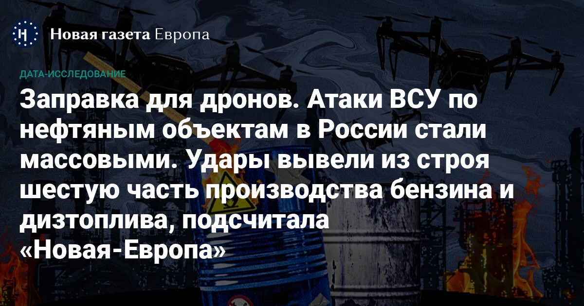 Атаки ВСУ на объекты нефтяной отрасли России стали массовыми за последние недели и к середине марта смогли вывести из строя примерно шестую часть (16%) от российского производства автомобильного топлива. По подсчетам «Новой газеты Европа», потери нефтеперерабатывающих заводов (НПЗ) в среднемесячном выражении составляют примерно 0,7 млн тонн бензина и 1,1 млн тонн дизтоплива. В большинстве случаев ремонты установок на крупных предприятиях могут продлиться не один месяц.