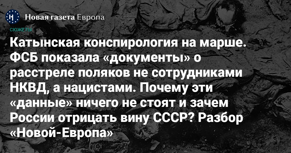 11 апреля ФСБ опубликовала «новые документы», якобы свидетельствующие о том, что военнопленные поляки в смоленской Катыни были расстреляны нацистами, а не органами НКВД. Появились эти «бумаги» аккурат к 13 апреля, когда в Польше отмечается День памяти жертв Катынского преступления. На протяжении десятилетий советские власти лгали об этом преступлении, перекладывая ответственность на нацистов. Правду признали только в перестройку. Сегодня в исторической науке нет никаких дискуссий по этому поводу, однако это не мешает российскому государству уже официально поддерживать конспирологов-«отрицателей».