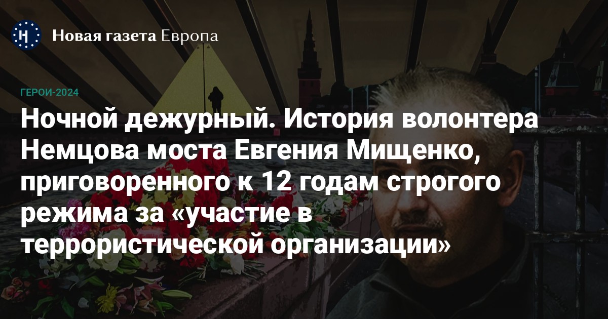 Иногда Евгений Мищенко ездил на Немцов мост не в свое дежурство — просто заезжал после работы: проведать единомышленников-волонтеров, узнать, не нужна ли помощь, удостовериться, что всё в порядке. Впрочем, у него и дежурства были вечерние и ночные. Часто он оставался на мосту на ночную вахту вместе с гражданским активистом Павлом Колесниковым. Прошлой осенью Евгения арестовали, а у Павла случился инсульт. Нынешней осенью Павел умер, а Евгения приговорили к 12 годам лишения свободы за «участие в террористической организации». Точнее, за переписку с легионом «Свобода России», воюющим на стороне Украины.