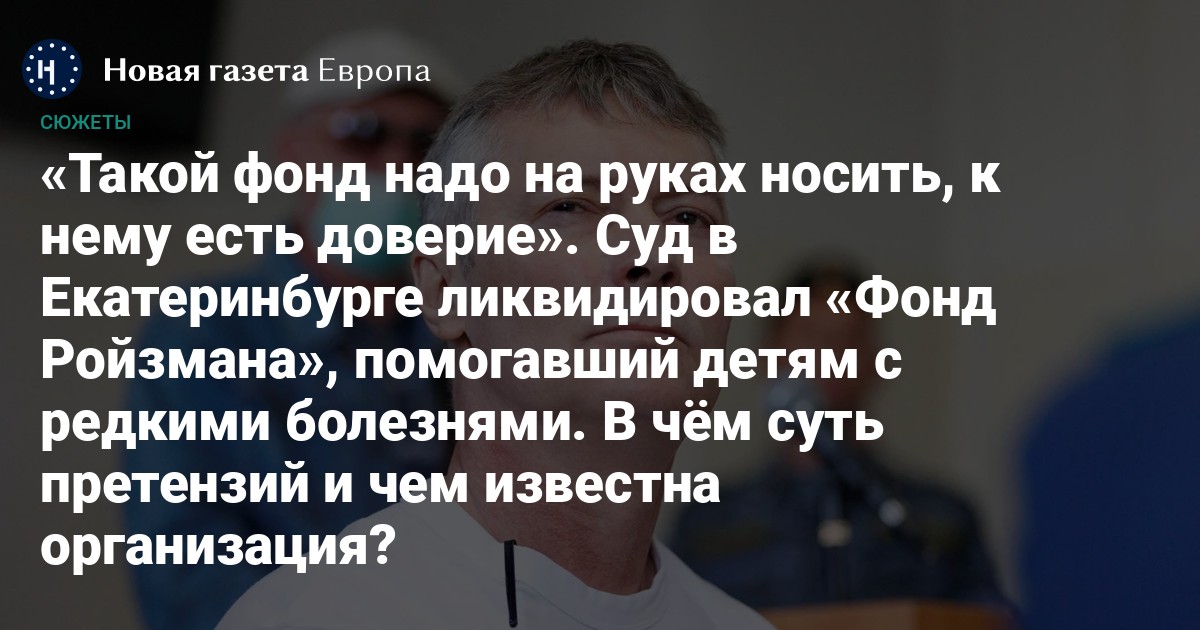 Суд в Екатеринбурге 14 апреля ликвидировал благотворительный «Фонд Ройзмана» — организацию, которая помогала детям с редкими заболеваниями. Таким образом судья Жанна Стекольникова удовлетворила иск управления Минюста по Свердловской области. Ведомство обвинило фонд в нецелевых тратах, при этом в самой организации обвинения отрицают.