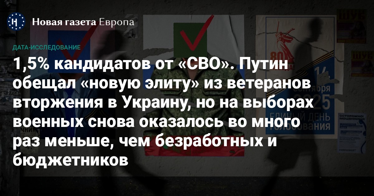 «Новая газета Европа» изучила списки «кандидатов от войны» на ближайших выборах, которые состоятся 14 сентября. Россияне будут выбирать губернаторов, депутатов региональных и городских парламентов, мундепов и глав поселков и городов. На выборах всех уровней мы нашли почти полторы тысячи военнослужащих или людей околовоенных специальностей; тем не менее, такие кандидаты по-прежнему составляют всего 1.5% претендующих на выборные должности. А пропаганда делает на военных несоразмерный акцент. «Новая-Европа» разобралась, попадут ли военные на значимые позиции и на кого делают реальную ставку действующие власти на этих выборах.