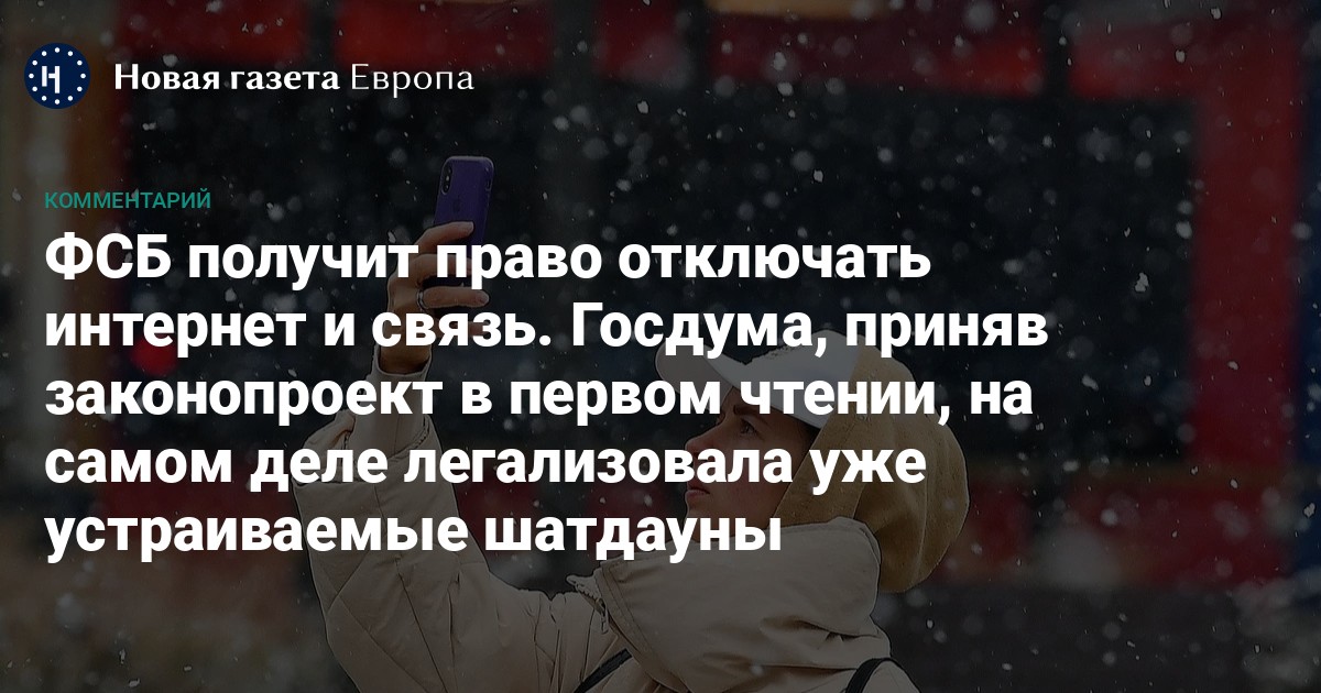 Госдума в первом чтении приняла законопроект, обязывающий операторов связи по требованию ФСБ отключать любые услуги связи: от стационарного интернета до телефонии. Формально — под предлогом угроз безопасности.